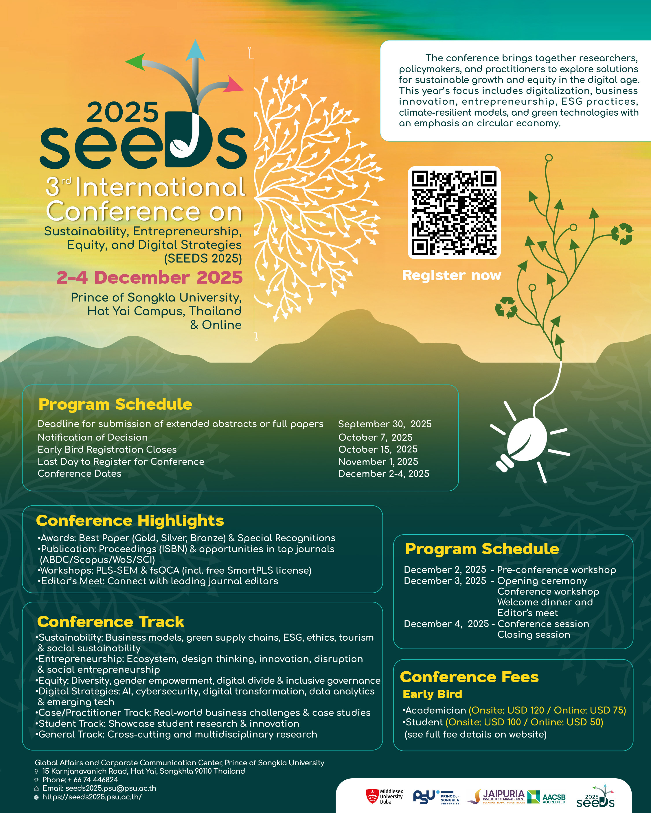 The Jaipuria Institute of Management, Noida, India, and Middlesex University Dubai, in partnership with Prince of Songkla University, are delighted to invite you to the 3rd International Conference on Sustainability, Entrepreneurship, Equity, and Digital Strategies (SEEDS 2025), to be held from 2-4 December 2025 in a hybrid mode: onsite at Prince of Songkla University, Hat Yai Campus, Thailand, and with online participation available.